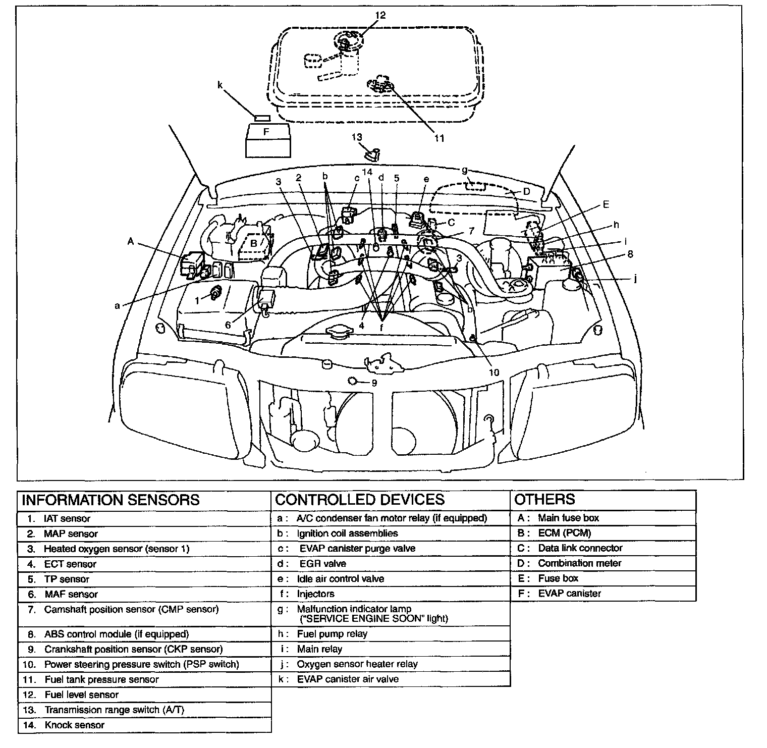 The electronic control system consists of 1) various sensors which detect the state of engine and driving conditions, 2) ECM (PCM) which controls various devices according to the signals from the sensors and 3) various controlled devices.Functionally, it is divided into the following sub systems: