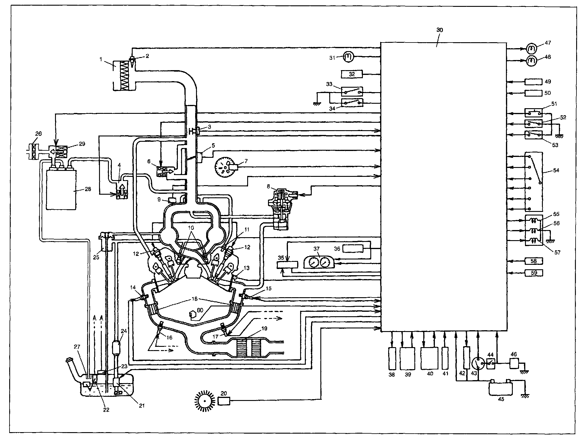 Fuel delivery system includes fuel pump, delivery pipe, fuel pressure regulator, fuel injectors, etc. Electronic control system includes ECM (PCM), various sensors and controlled devices.