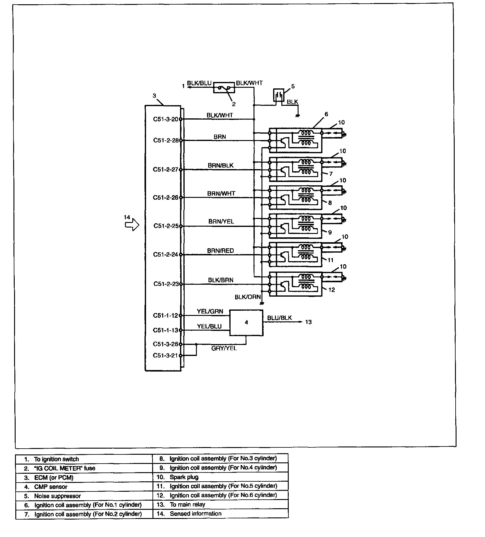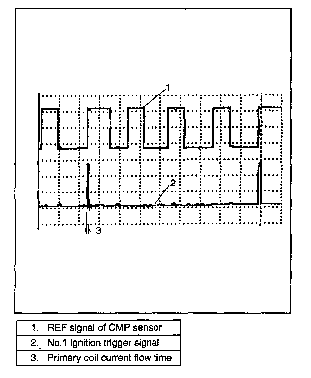 Oscilloscope waveforms of CMP sensor REF signal and No.1 ignition trigger signal are as shown in figure when connecting oscilloscope between terminal C51-1-13 of ECM (PCM) connector connected to ECM (PCM) and ground, and between terminal C51-2-28 and ground.