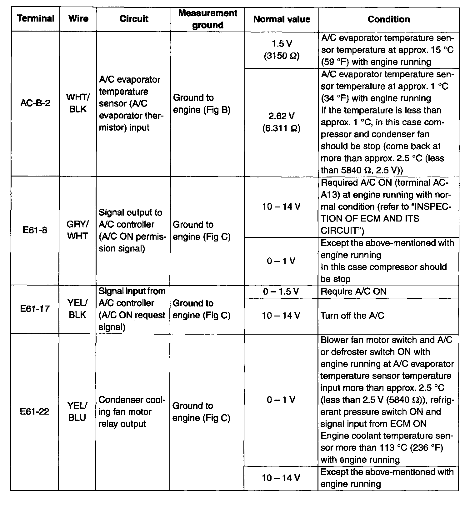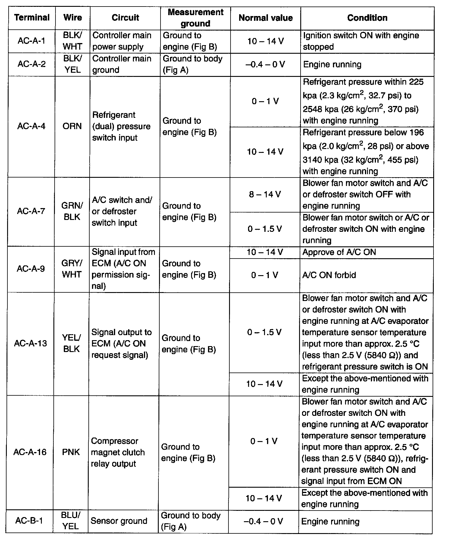 A/C Controller Voltage Values Table (Part 1):