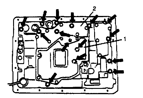 18. Remove valve body (2) mounting bolts as shown in the figure.