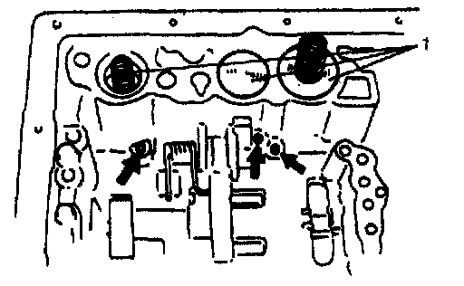 21. Remove accumulator pistons (1) by blowing air into holes indicated in the figure.