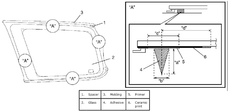- Before applying primer to glass edge, install molding according to installing position shown in the figure.
