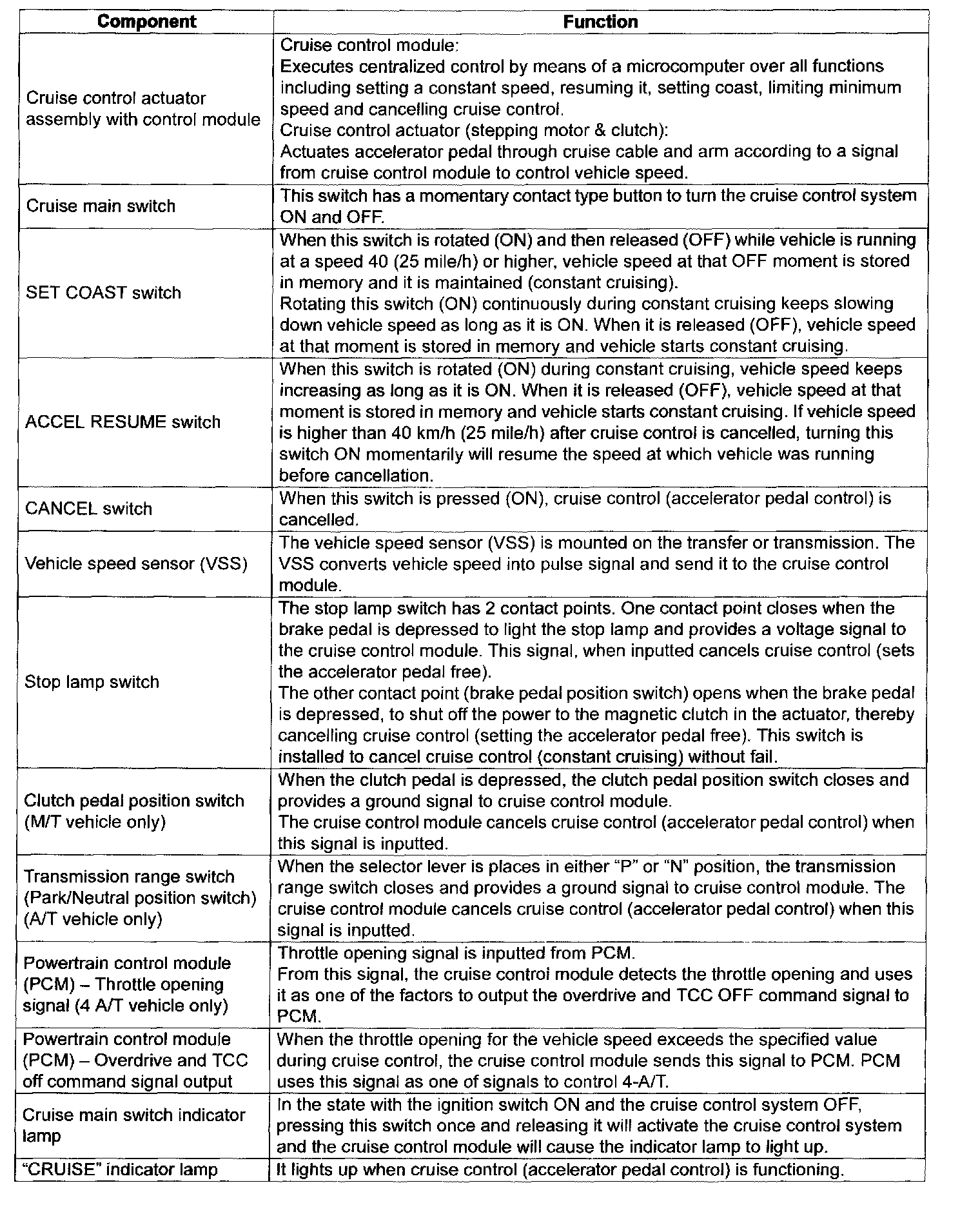 The cruise control system is a device which maintains a preset vehicle speed. while driving at a high speed, e.g., on a highway. It allows the driver to drive his vehicle at a constant speed of 40 km/h (25 mile/h) or higher without depressing the accelerator pedal (constant cruising). The system also has such functions as to change the vehicle speed without operating the accelerator pedal (but using SET COAST and ACCEL RESUME switches), cancel cruise control (CANCEL switch) and resume the speed in memory automatically after cruise control is cancelled (ACCEL RESUME switch). The system mainly consists of a vehicle speed sensor, an actuator assembly incorporated with control module, cruise main switch, SET COAST switch, ACCEL RESUME switch and CANCEL switch, etc.