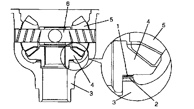 6. Select adjusting shim(s) (2) closest to calculated value from among the following available sizes and put it in place and then press-fit rear bearing (1).