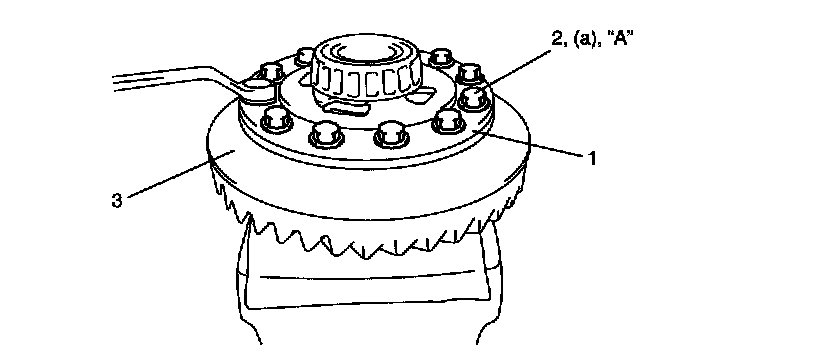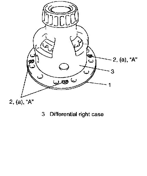 8. Put drive bevel gear (3) on differential case (1) and fasten them with bolts (2) by tightening them to specified torque. Use thread lock cement for bolts (2).