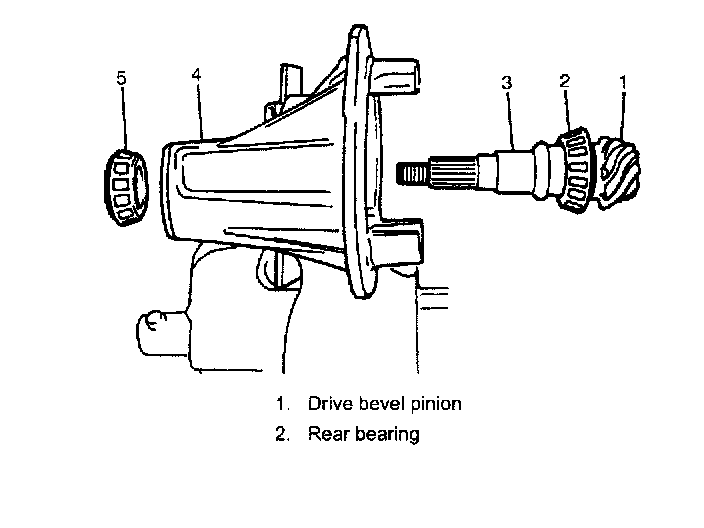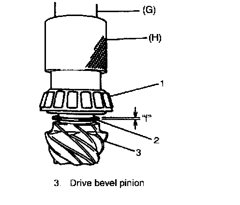 To engage drive bevel pinion and gear correctly, it is pre-required to install drive bevel pinion to differential carrier properly by using adjusting shim as described on the followings. Shown below is relative positions of drive bevel pinion differential carrier and mounting dummy.