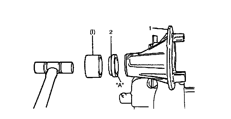 8. Using special tool and plastic hammer, drive oil seal (2) into differential carrier (1) till it becomes flush with carrier end. Then apply grease "A" to oil seal lip.