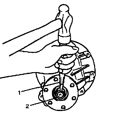1. Install special tools with bearings and universal joint flange (2) to differential carrier (1).