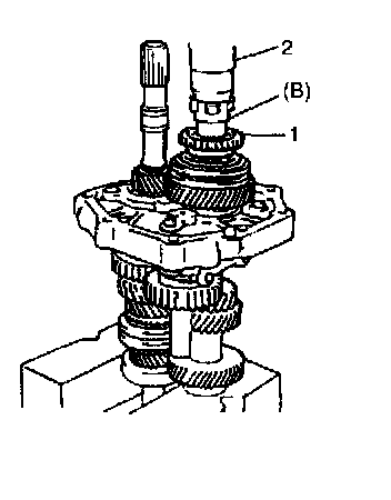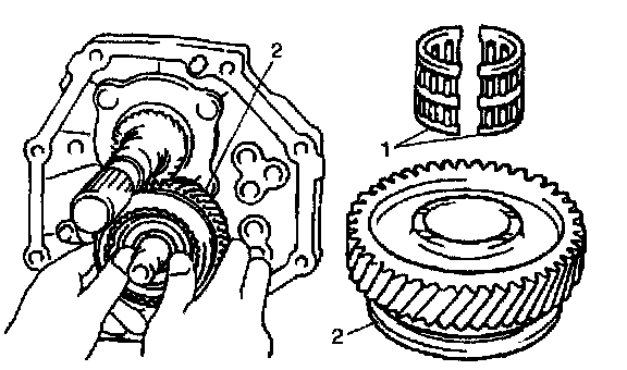 11. Install needle bearing (1), counter shaft 5th gear (2) and synchronizer ring.
