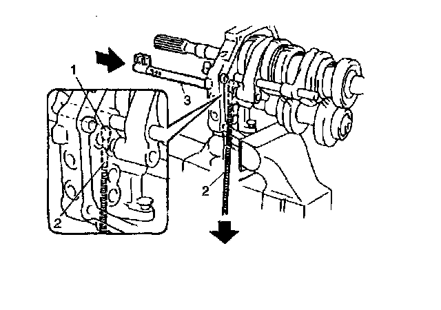 26. Supporting locating roller No. 1 (1) with magnet (3), insert reverse gear shift shaft (2) into reverse gear shift link and intermediate case.