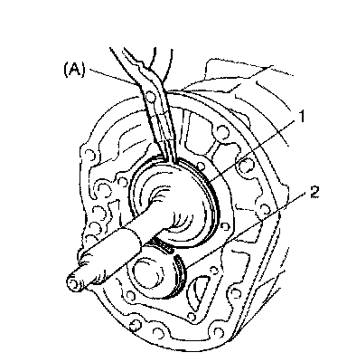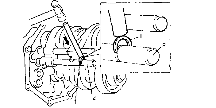 22. Fix with new circlip (1) to low gear shift shaft (2) by using lever or the like and hammer.