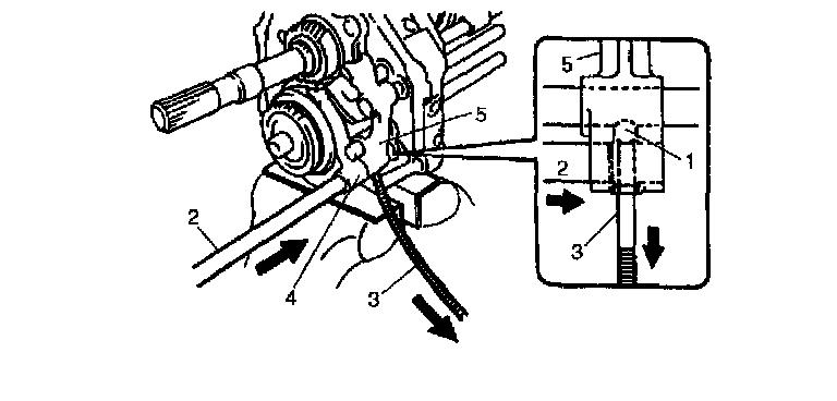 30. Supporting ball (1) with magnet (3) as shown in the figure, insert 5th gear shift shaft (2) to 5th gear shift fork (4) and reverse gear shift yoke (5).