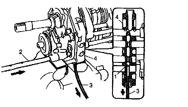 31. Supporting ball (1) with magnet (3) as shown in figure, insert 5th gear shift shaft (2) into intermediate case (4).