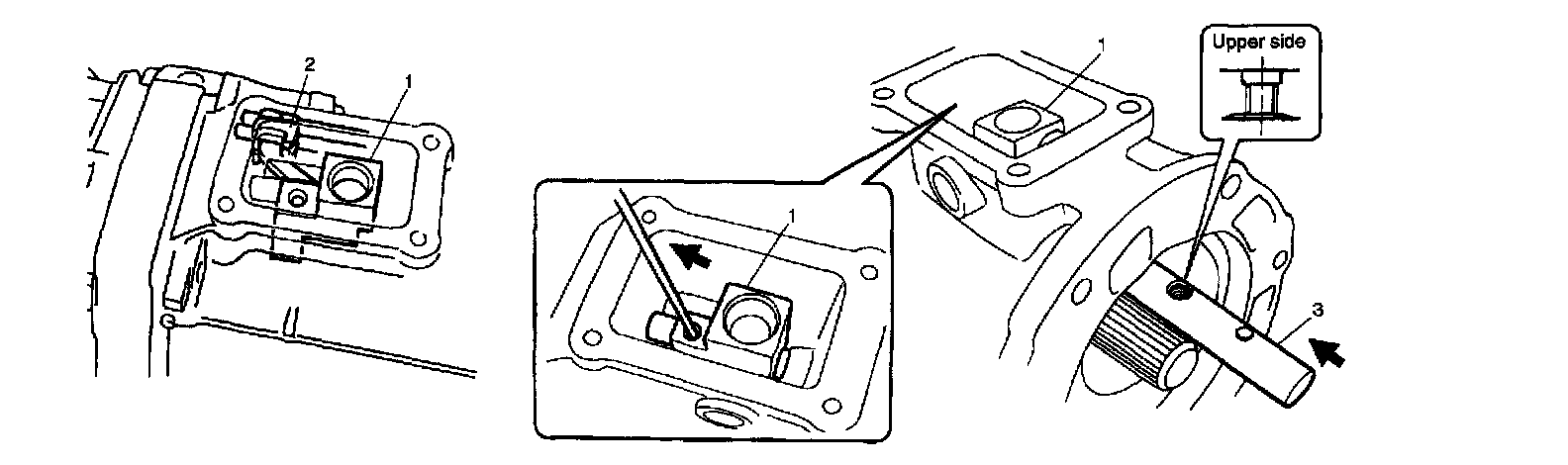 25. Insert reverse gear shift shaft (2) into reverse gear shift link assembly and intermediate case while holding locating roller No. 1 (1) with magnet (3).