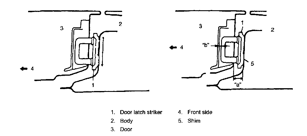 - Move door latch striker sideways to adjust door surface flush with body surface, as shown.