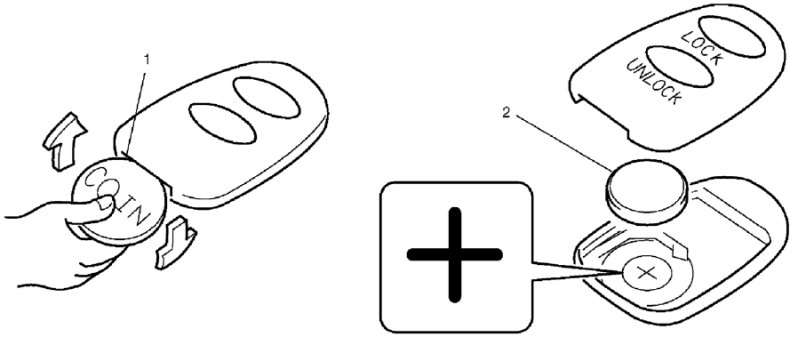 2. Replace the battery (lithium disc-type CR2032 or equivalent) (2) so its "+" terminal faces the "+" mark of the transmitter.