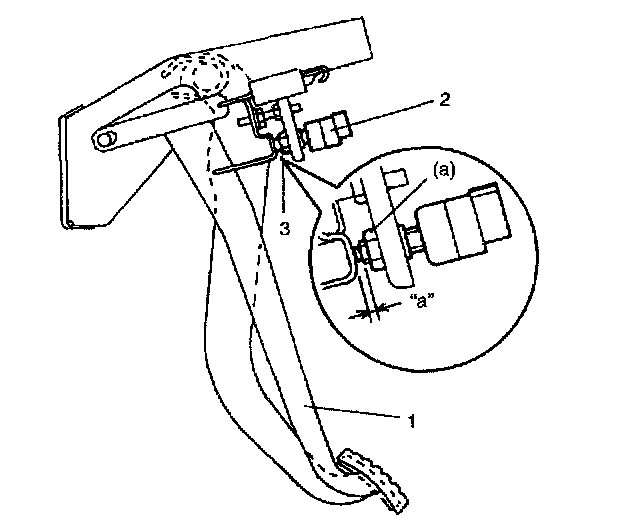 2. With clutch pedal (1) released, adjust switch position so that clearance between end of thread and clutch pedal bracket is within specification.