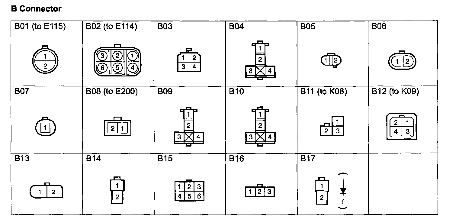 The illustrations below show the harness side connectors, but not the component side connectors.