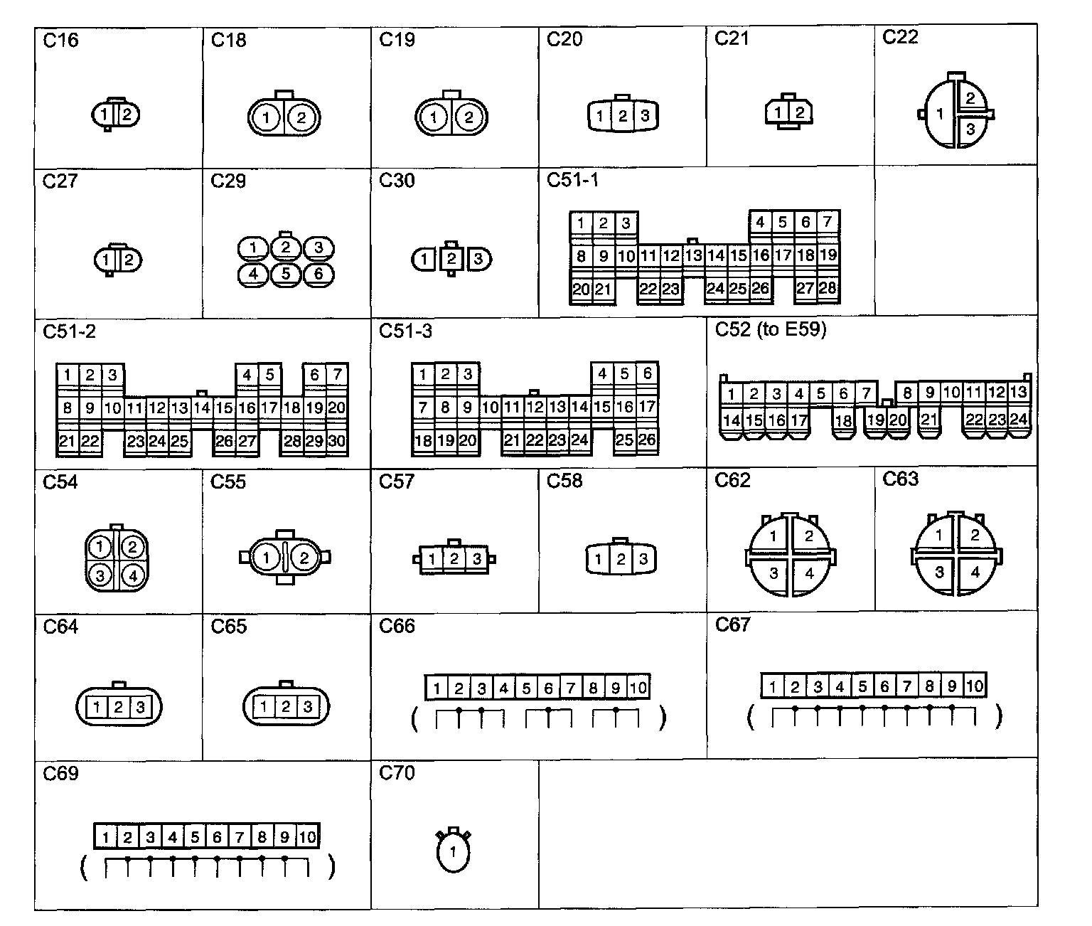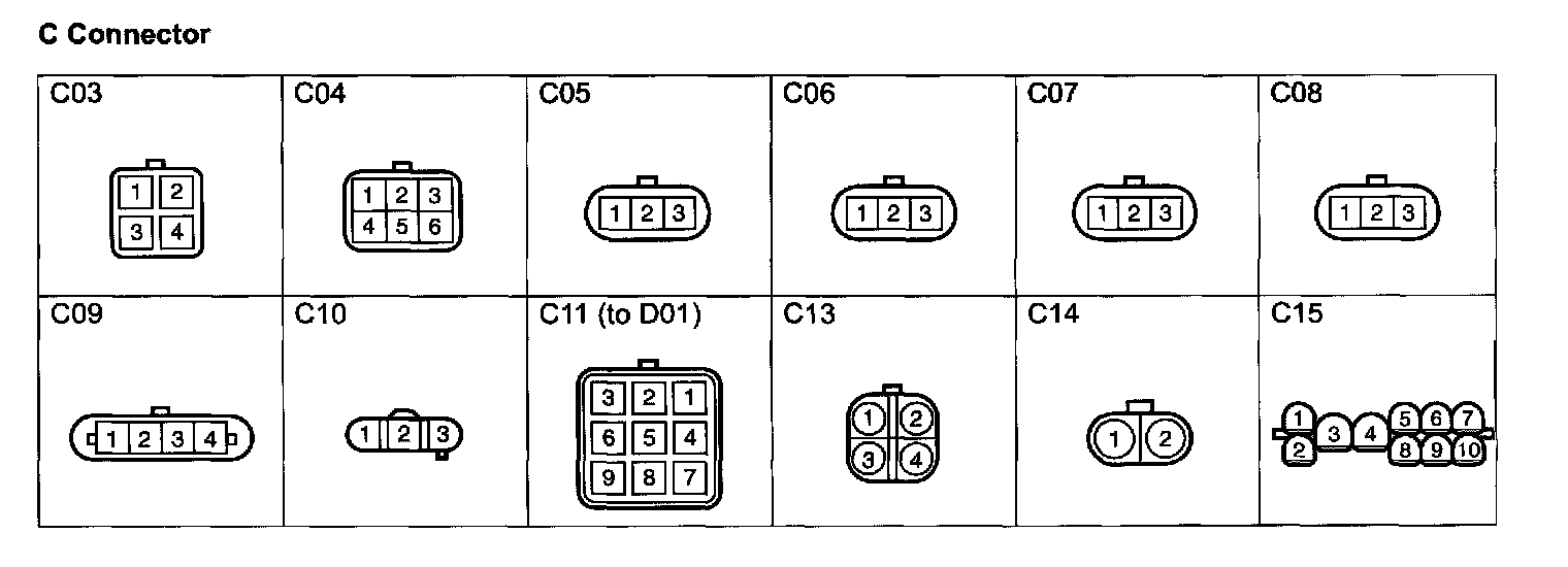 The illustrations below show the harness side connectors, but not the component side connectors.