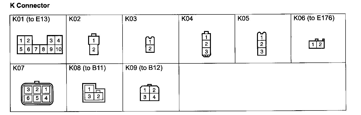 The illustrations below show the harness side connectors, but not the component side connectors.