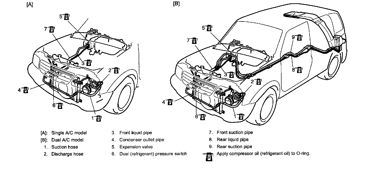 When replenishing or changing refrigerant and compressor oil and when replacing parts, make sure that the material or the part to be used is appropriate to the A/C installed in the vehicle being serviced. Use of incorrect one will result in leakage of refrigerant, damage in parts or other faulty condition.