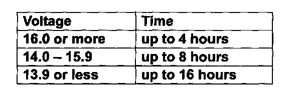 4. Battery chargers vary in the amount of voltage and current they provide. Time required for battery to accept measurable charger current at various voltages may be as follows.
