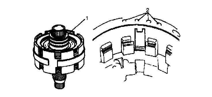 10. After confirming that lugs of all brake plates and brake discs are in grooves securely, hold retaining direct clutch ring (1) of planetary sun gear, install center support assembly by aligning fluid holes (2) in center support and transmission case.