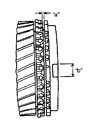 Check clearance "a" between synchronizer ring and gear, key slot width "b" in synchronizer ring and each chamfered tooth of gear and synchronizer ring and replace with new one, if necessary. Also, check gear tooth.
