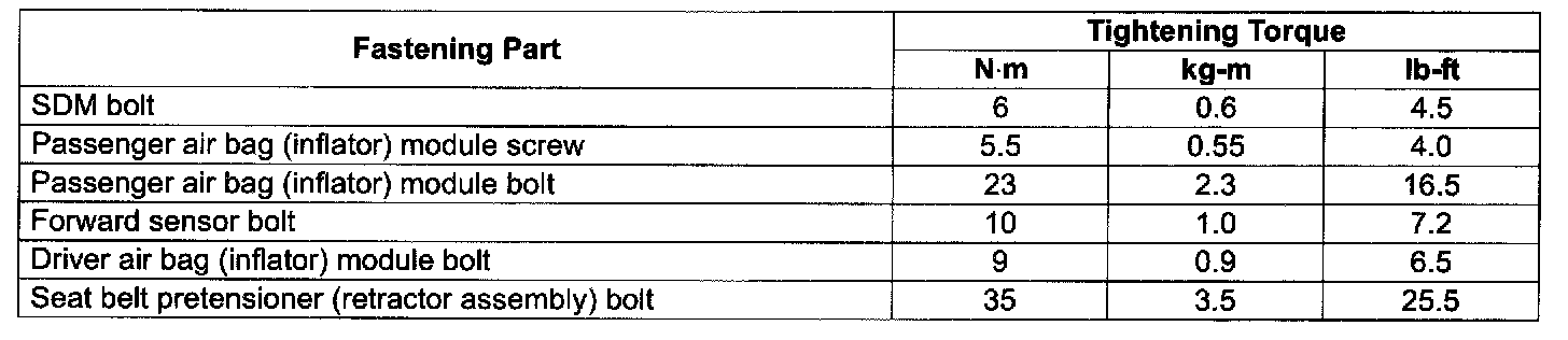 Tightening Torque Specifications: