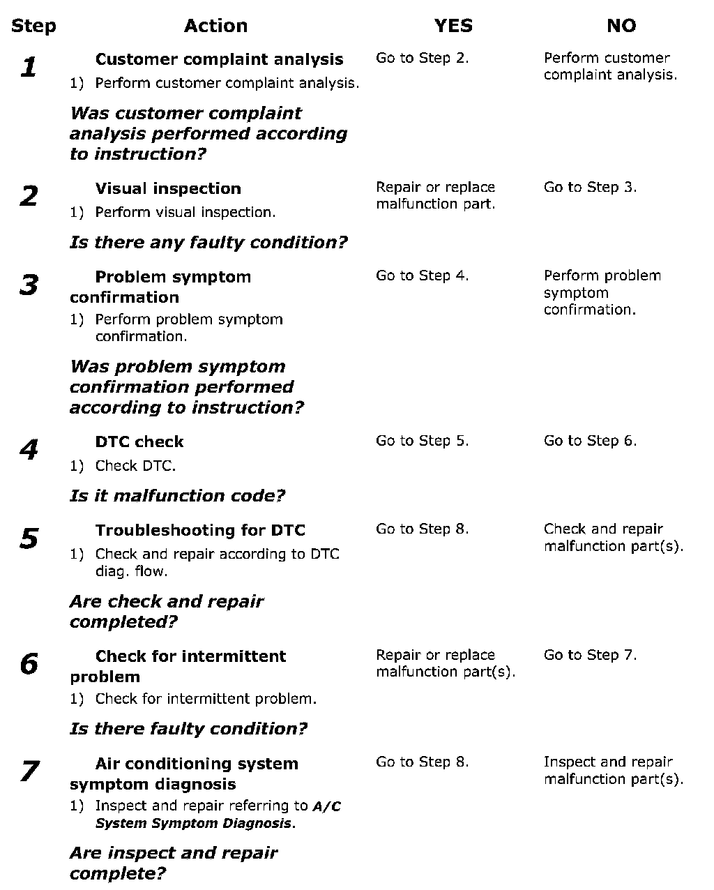 As a preliminary step, be sure to perform visual check of the items that support proper function of the air conditioning system referring to Visual Inspection.