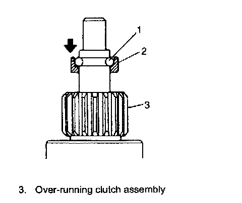 9. Install over-running clutch assembly (1) to gear shaft (4), using care for installing direction of pinion stop ring (2).