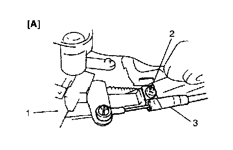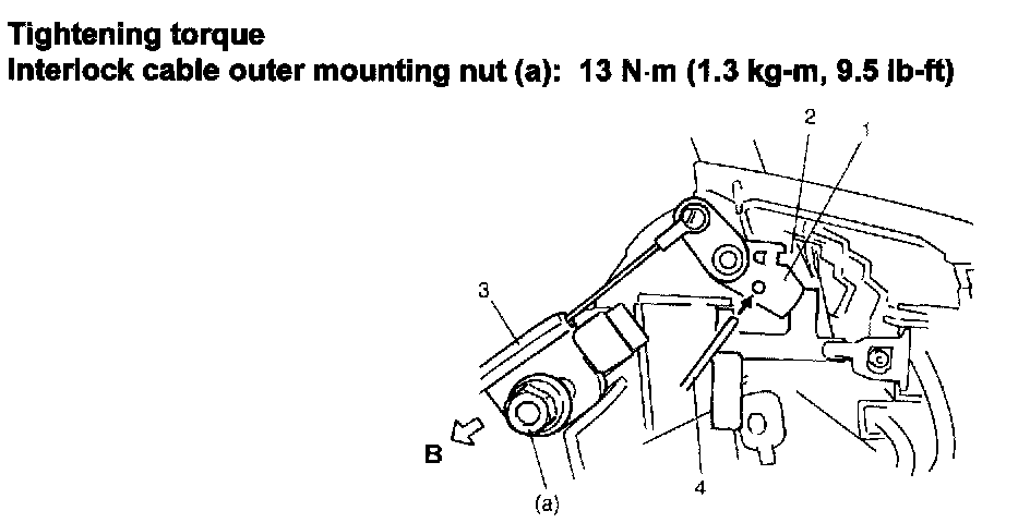 b) Install cable end to interlock cam (1) and stud bolt and after making sure that cable outer (3) is pushed in arrow direction B by leaf spring, tighten mounting nut to specified torque. Remove pin (1).