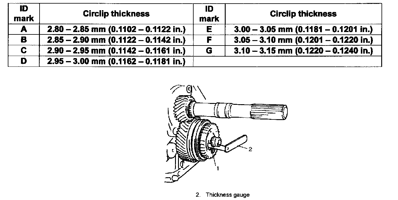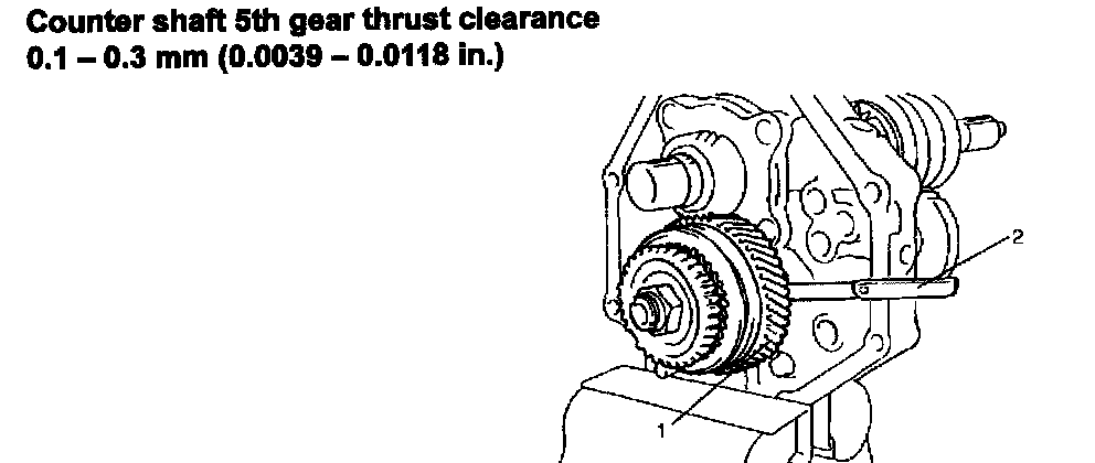 16) Check counter shaft 5th gear (1) thrust clearance by using thickness gauge (2).