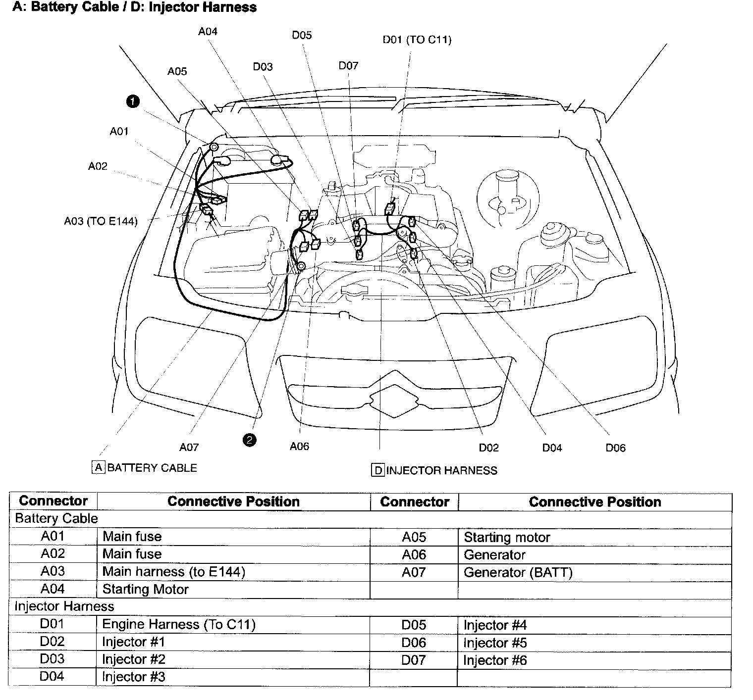 A: Battery Cable / D: Injector Harness: