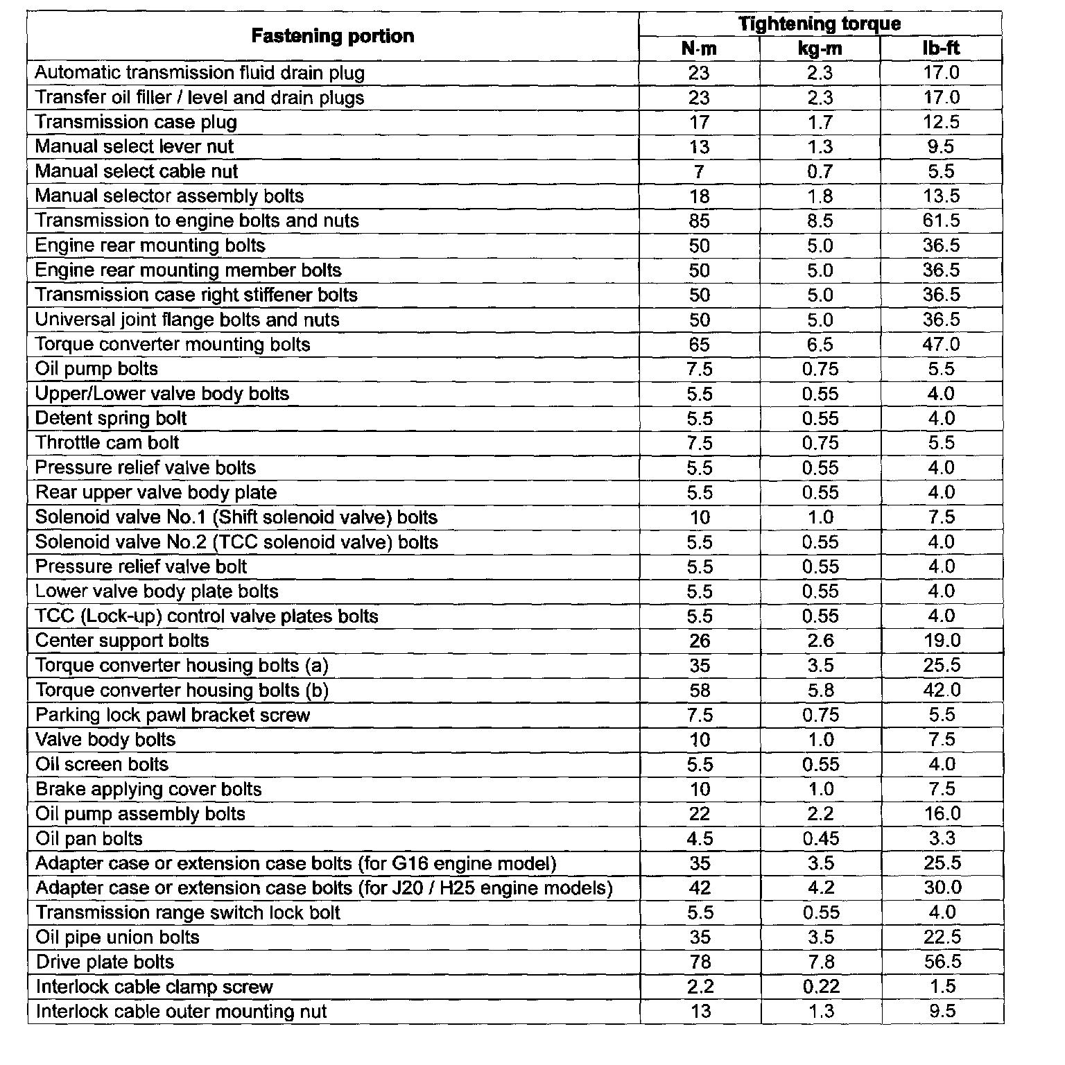 Tightening Torque Specifications
