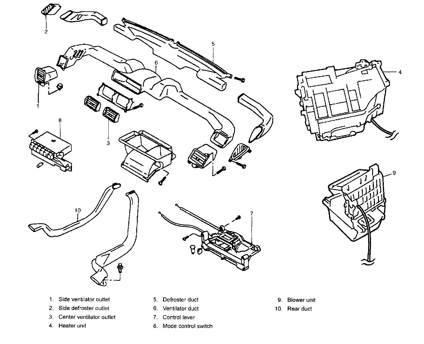 The heater, an in and out air selectable-type hot water heater, is so constructed that it is possible to assure an agreeable ventilation at all times by providing the ventilator air outlets at the center and both sides (right and left) of the instrument panel, the hot air outlet at a place close to the feet of front passengers, and the defroster air outlets at places, right and left, along the windshield glass.