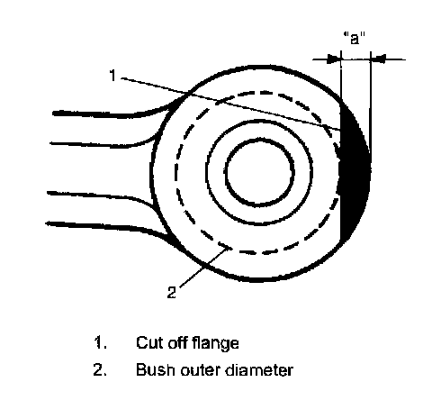 3. Cut flange part of control arm bush (rubber and steel) with using care not to damage control arm end surface.