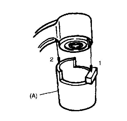 4. Place control arm and special tool on hydraulic press. Set control arm cutting flange to welded part (1) of the special tool and control arm joint side to the stepped part (2) of special tool.