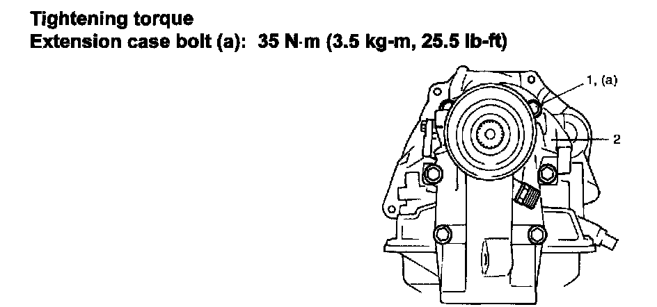 3) Install new gasket and extension case (2) to transmission. Tighten bolts (1) to specified torque.