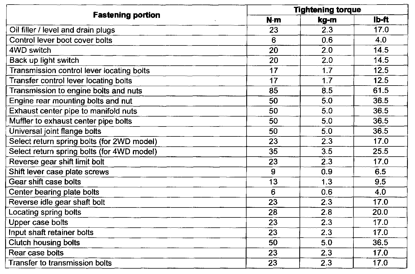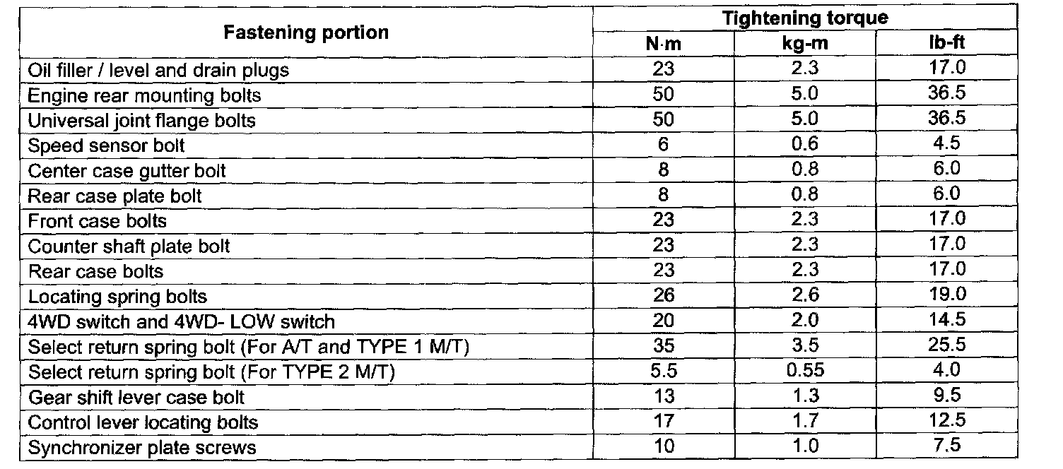 Tightening Torque Specifications