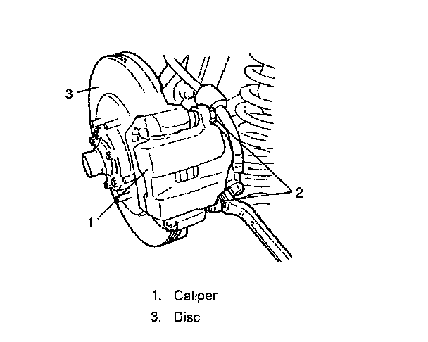 NOTE: Hang removed caliper (1) with a wire hook (2) or the like so as to prevent brake hose from bending and twisting excessively or being pulled. Don't operate brake pedal with pads removed.