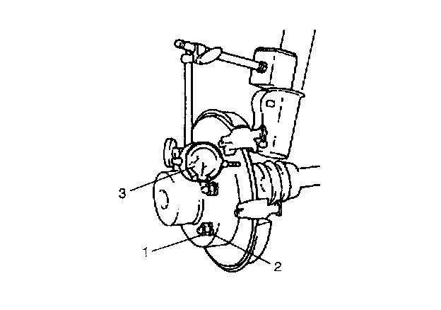 Use wheel nuts (1) and suitable plain washers (2) to hold the disc securely against the hub, then mount a dial gauge (3) as shown in the figure and measure the runout at 25 mm (0.98 inch) from the outer edge of the disc.