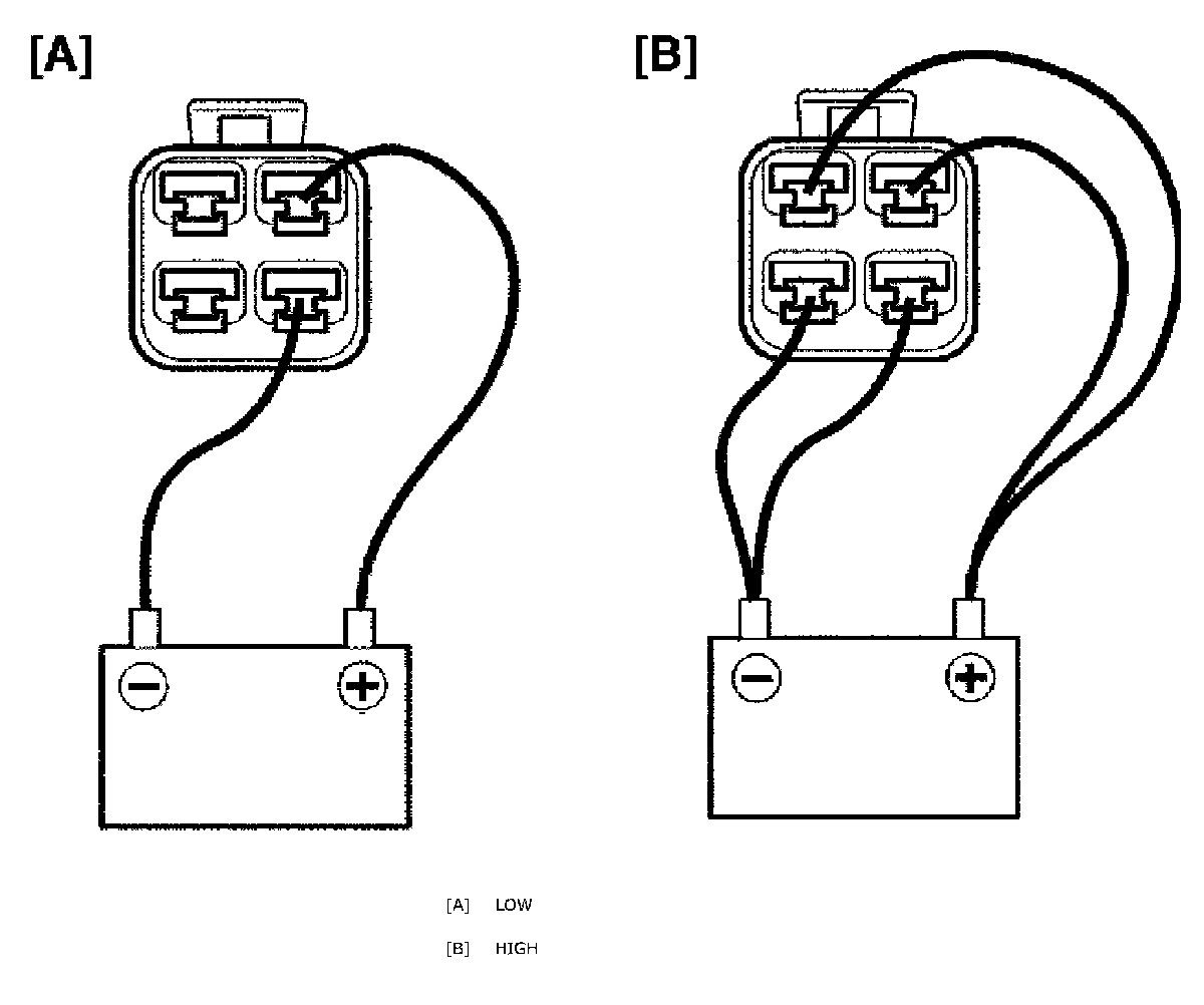 - Connect battery to condenser fan motor as shown in figure, and then check if it operates smoothly and fan speed varies.