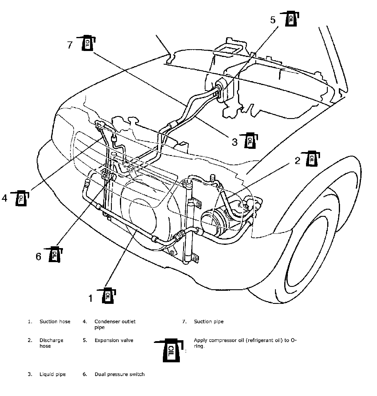 - When connecting hoses and pipes, apply a few drops of compressor oil (refrigerant oil) to seats of coupling nuts and O-ring.