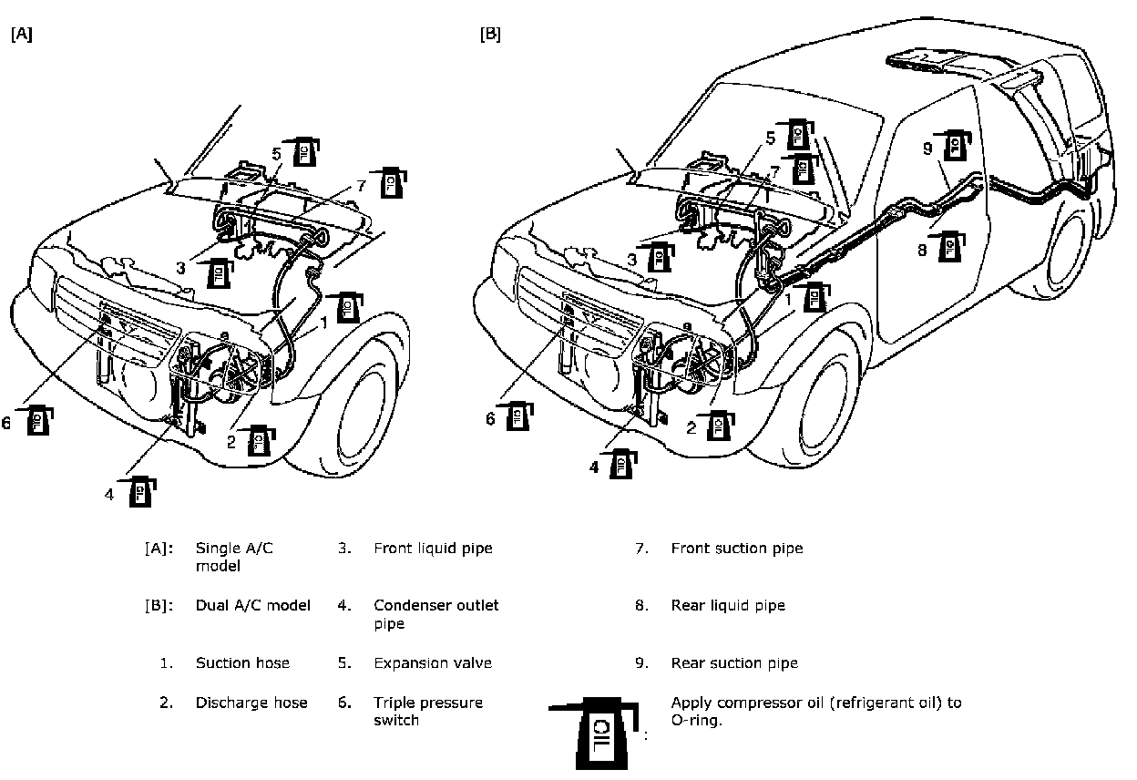 When replenishing or changing refrigerant and compressor oil and when replacing parts, make sure that the material or the part to be used is appropriate to the A/C installed in the vehicle being serviced.
