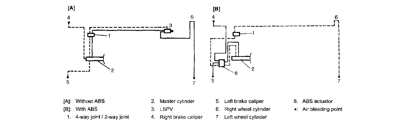 Air bleeding is necessary at right and left front wheel brakes, left rear wheel brake and LSPV (if equipped without ABS), i.e. 4 places (3 places for vehicle with ABS) in all.