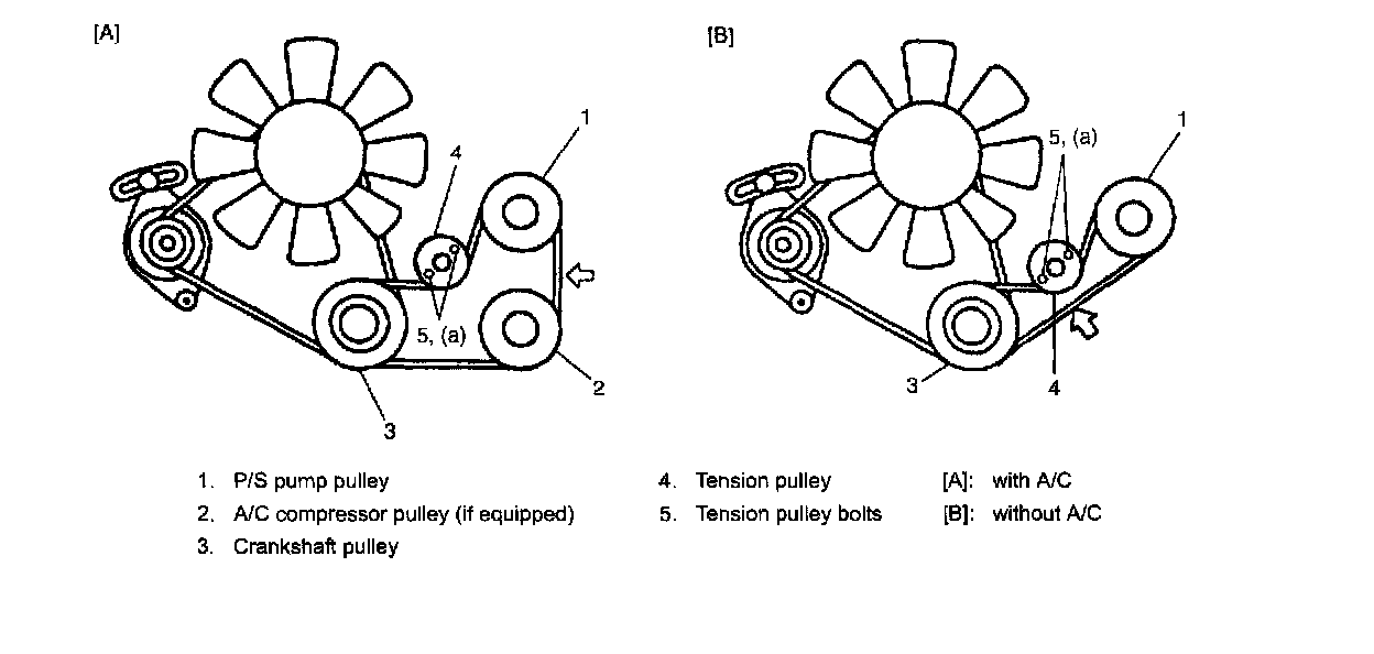 Adjustment1. To adjust P/S belt tension, loosen tension pulley bolts and turn tension pulley using hexagon wrench.