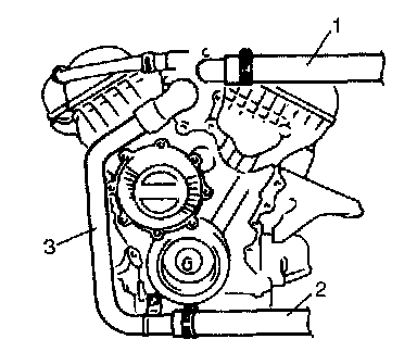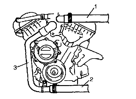 3. Remove radiator inlet hose (1), outlet hose (2) and radiator outlet pipe (3).