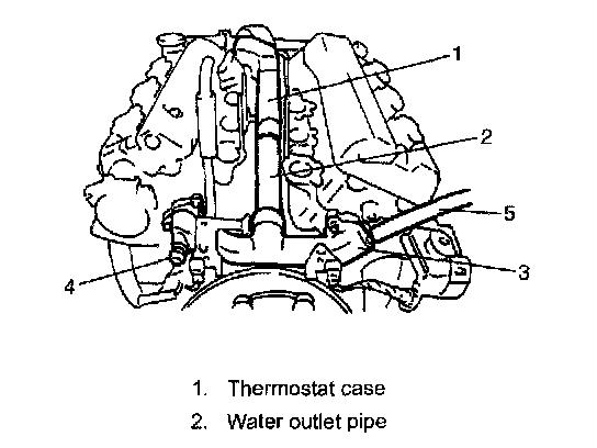 8. Remove water outlet pipe (2) from thermostat case (1).